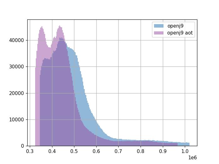 I also spent some CPU cycles on comparing the behaviour of AOT to JIT compiled code. I conducted this experiment with OpenJ9 since the AOT compiled code is still executed in a JVM. By contrast, GraalVM AOT compiled code would result in a native binary, which could not be benchmarked with JMH anymore.