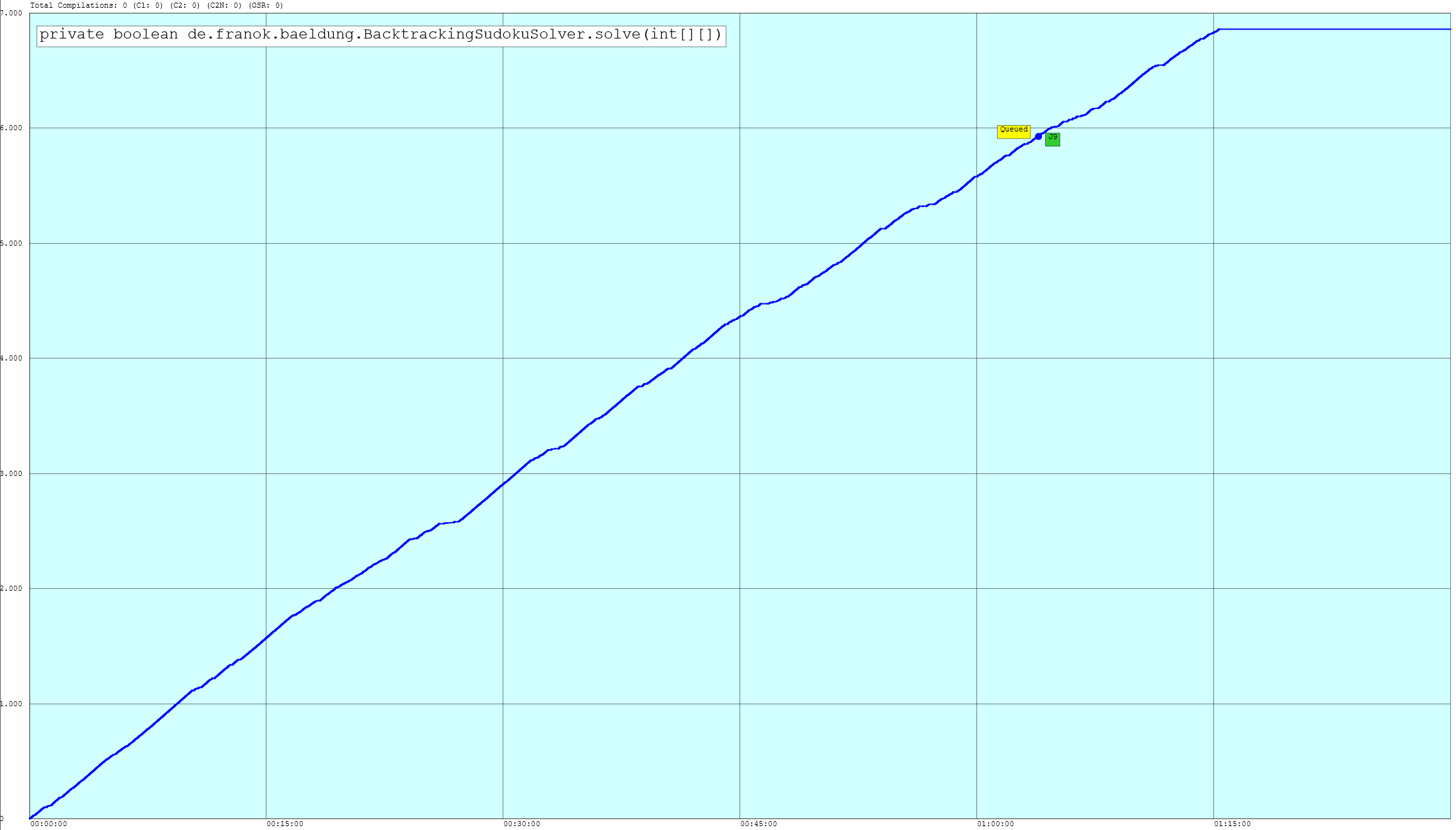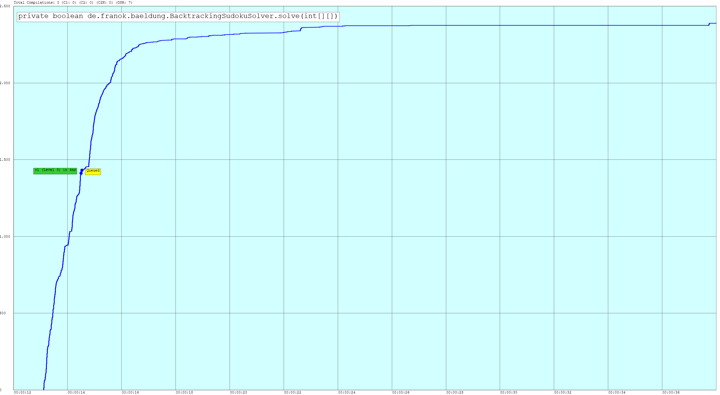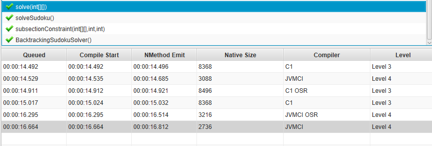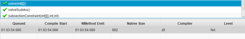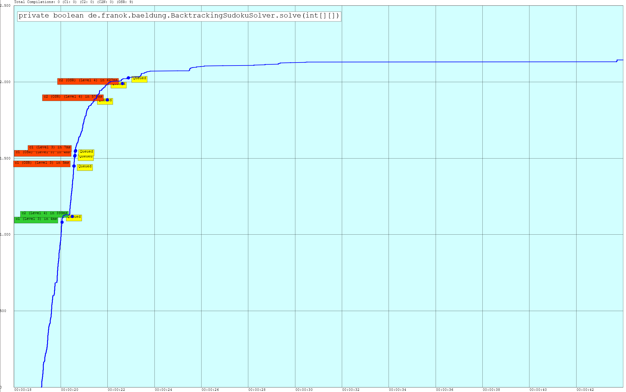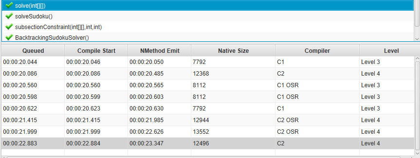solve(int[][]) method of my Sudoku benchmark [view]. The compilation timelines do not necessarily depict all compilation events on the graph, but the information can also be retrieved from the compilation list [view].