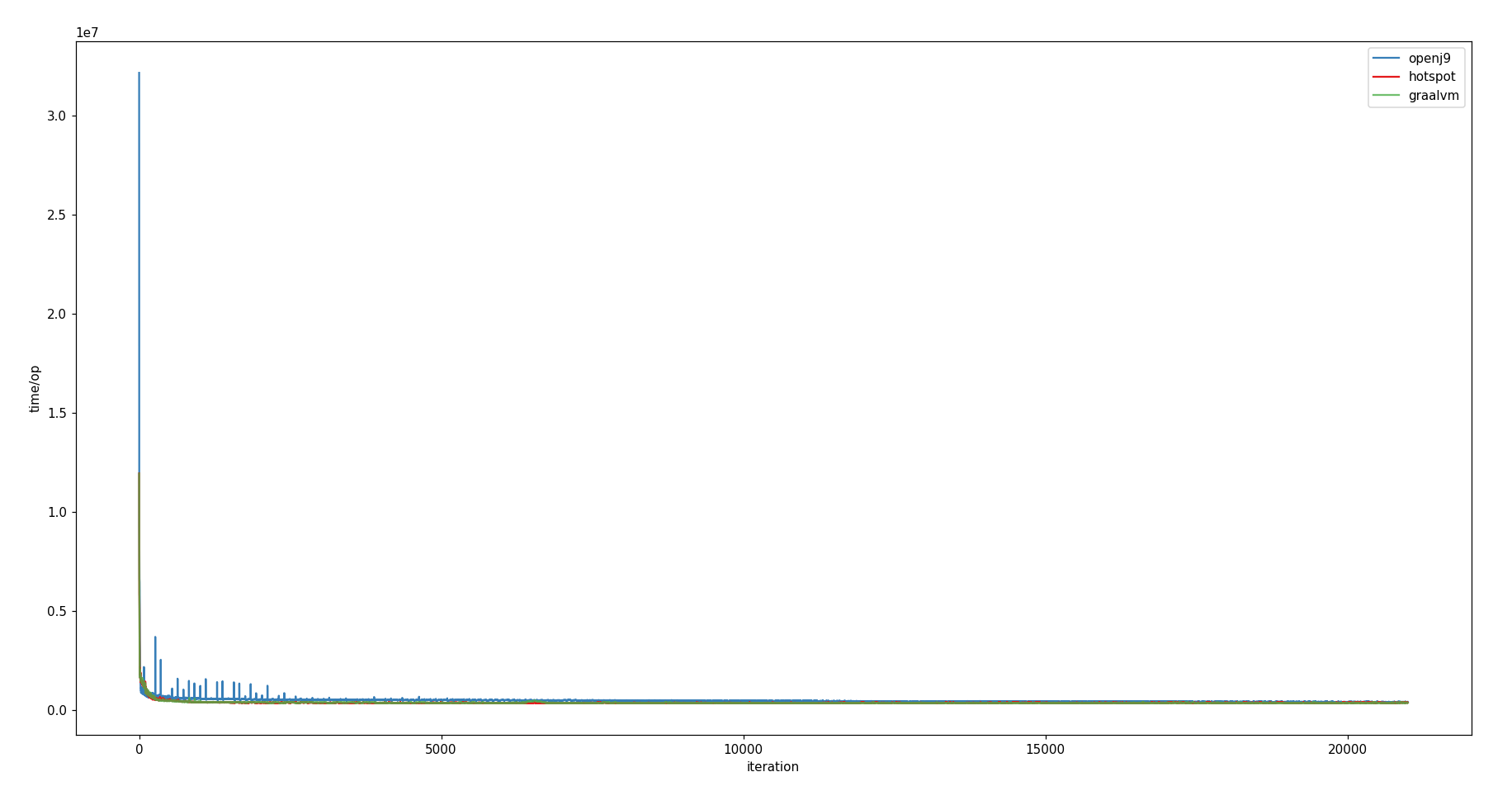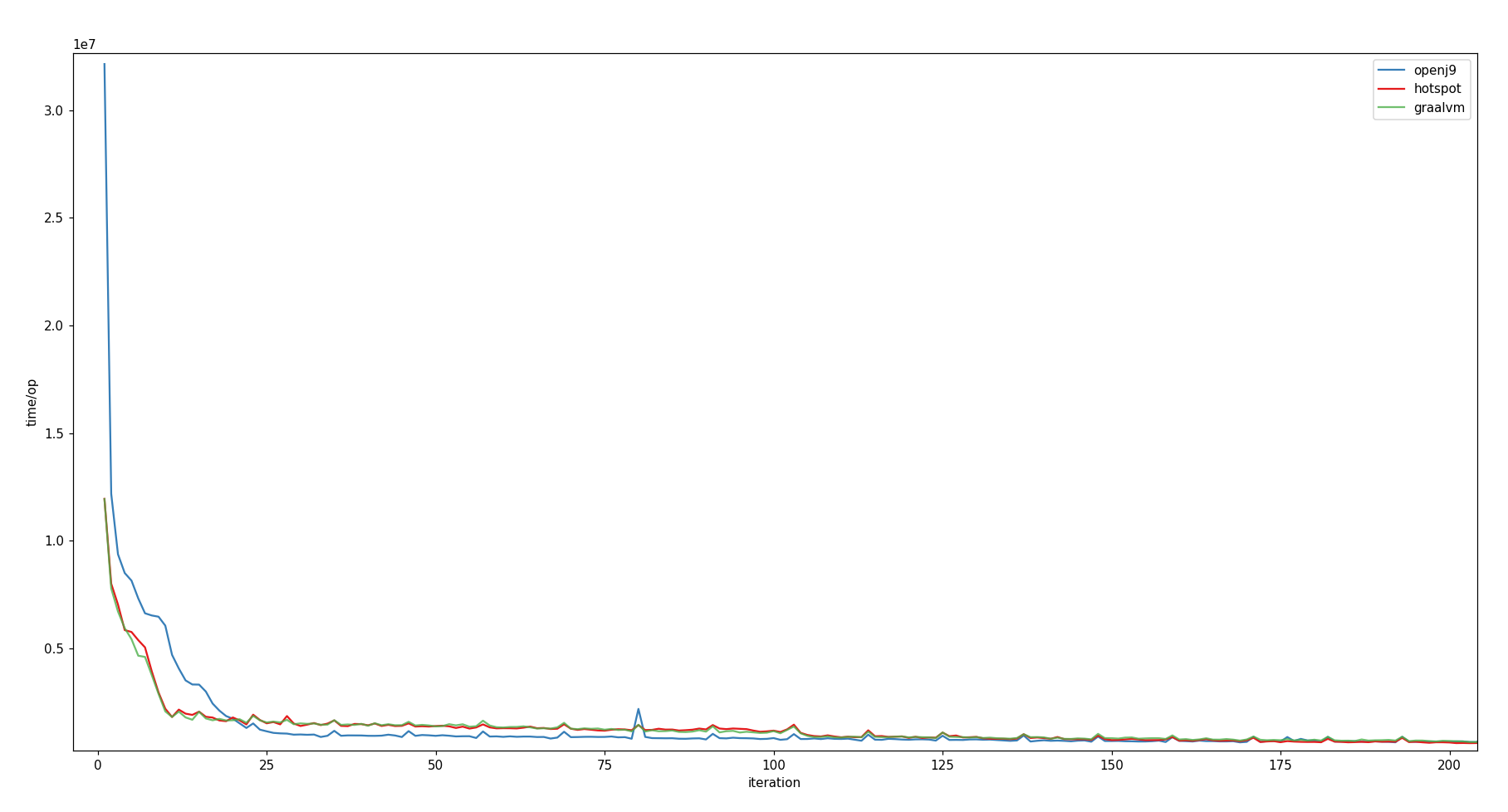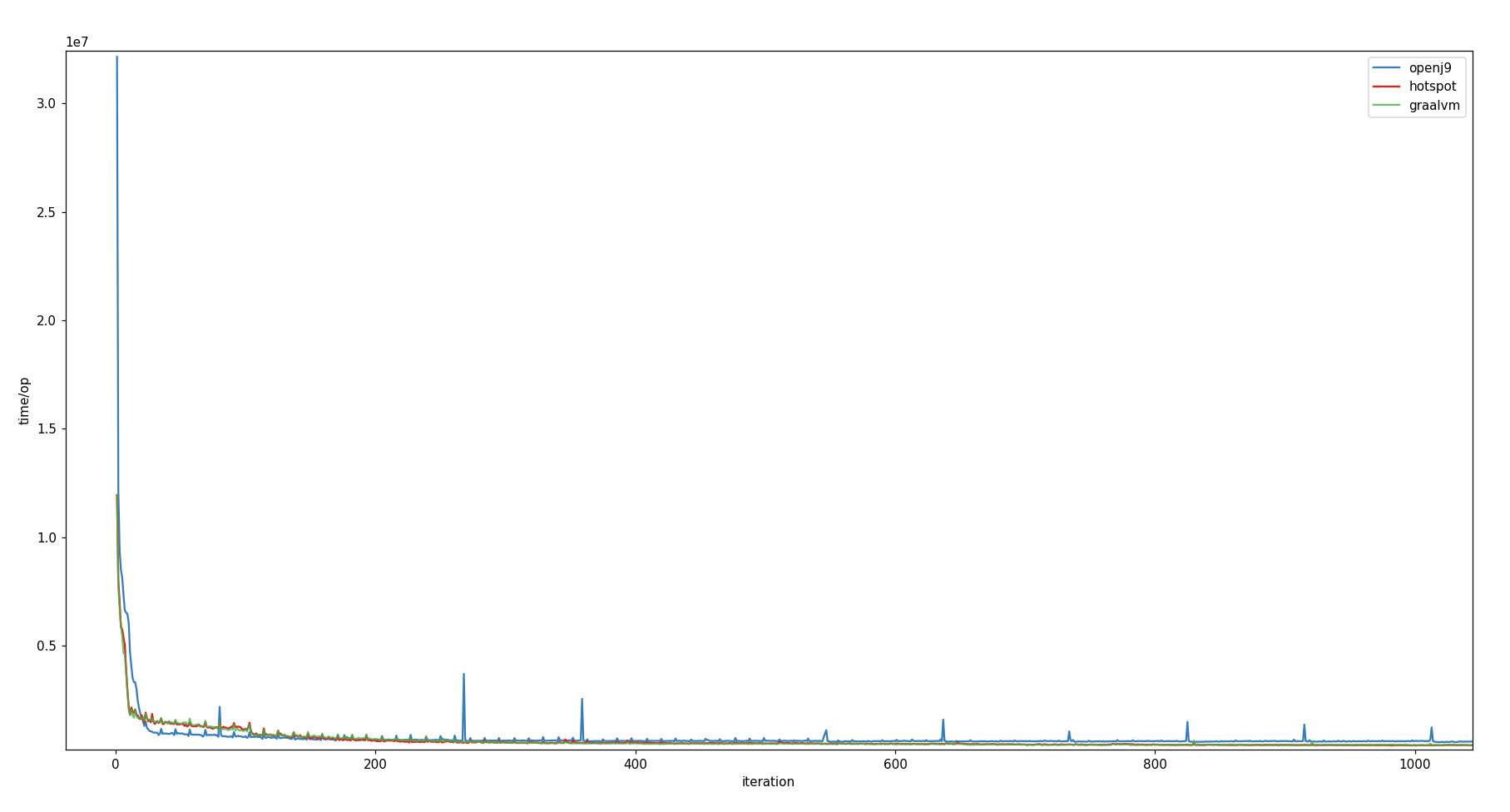 OpenJ9 also has a much steeper negative slope over the first iterations compared to HotSpot or GraalVM. This suggests that the OpenJ9 JVM performs faster in method warm-up than the other two.
