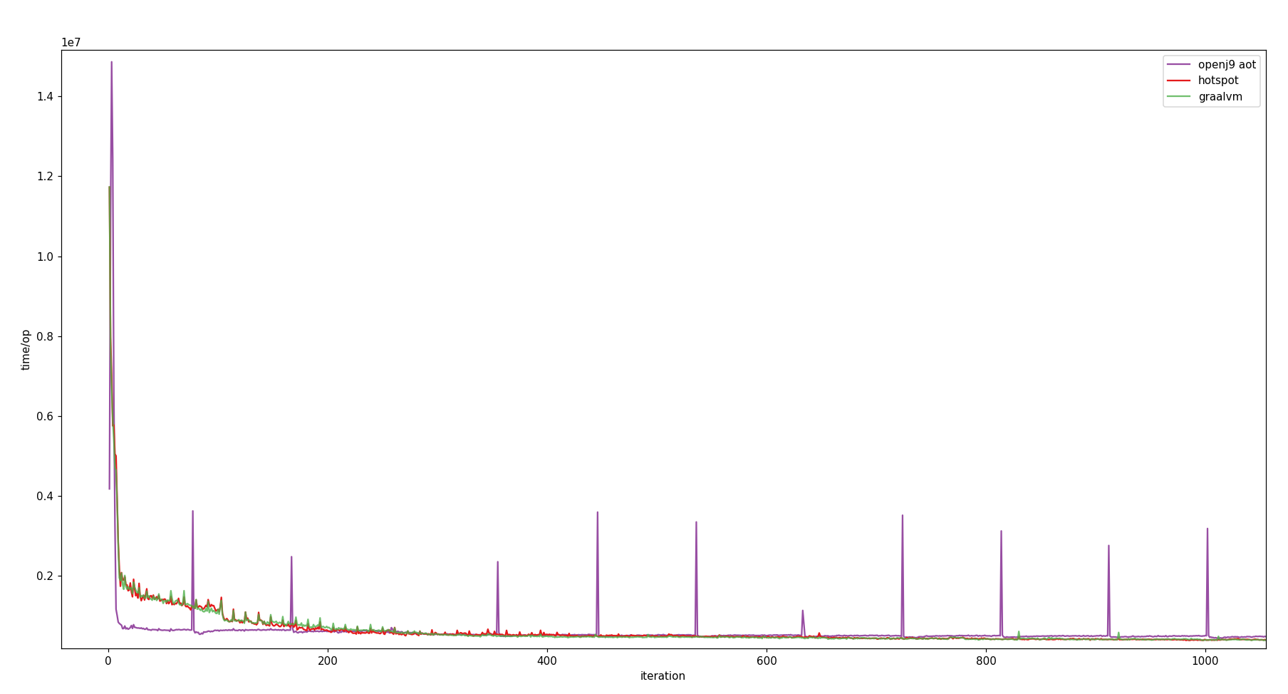 Also in comparison to HotSpot and GraalVM, OpenJ9 in AOT mode performs faster during the first iterations. However, the JIT compilers of HotSpot and GraalVM catch up with their opponent after approx. 250 iterations and clearly overtake it after approx. 700 iterations [view chart]. This kind of demonstrates that as long as the JVM with the JIT compiler is warming up, just interpreting bytecode, the JVM running AOT compiled code will perform faster. But as soon as the JIT compiler optimizations kick in, AOT code cannot really compete with the performance of JIT compiled code.