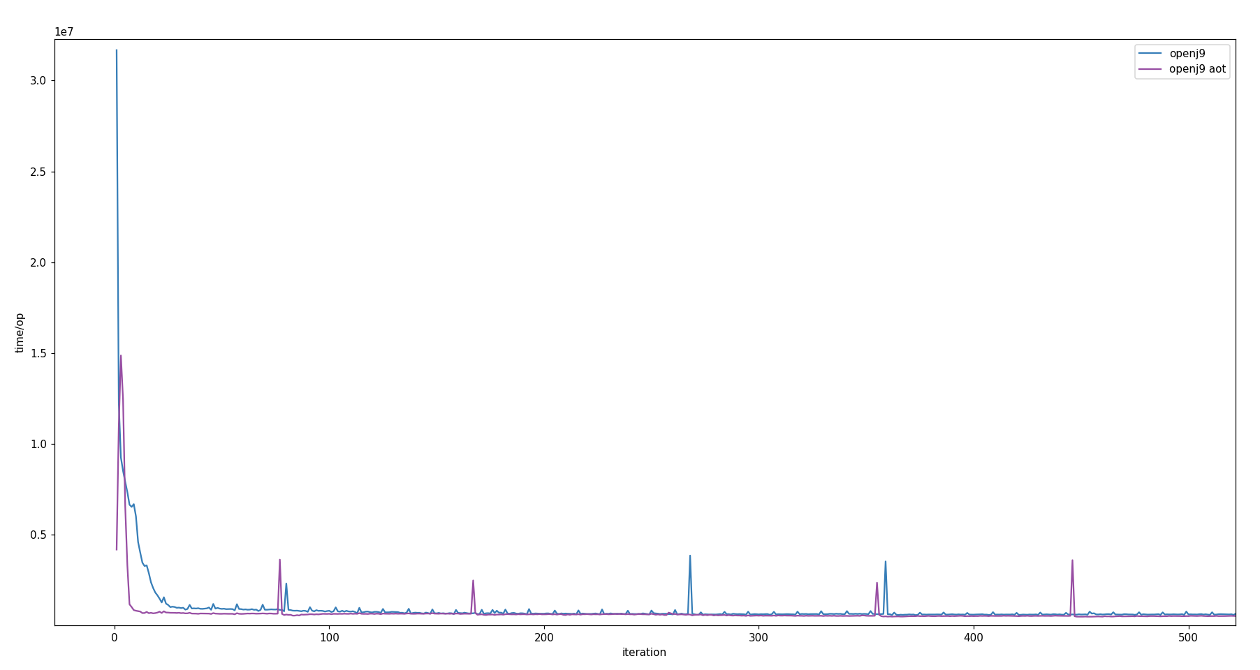 In order to leverage the OpenJ9 AOT compiler, one must provide -Xshareclasses:nonpersistent,verboseAOT as an additional runtime flag. This enables class data sharing. The first time, the benchmark is executed, OpenJ9 compiles AOT code and stores it beyond the JVM life time. The next time, the benchmark code is executed, OpenJ9 will directly use the AOT compiled code.