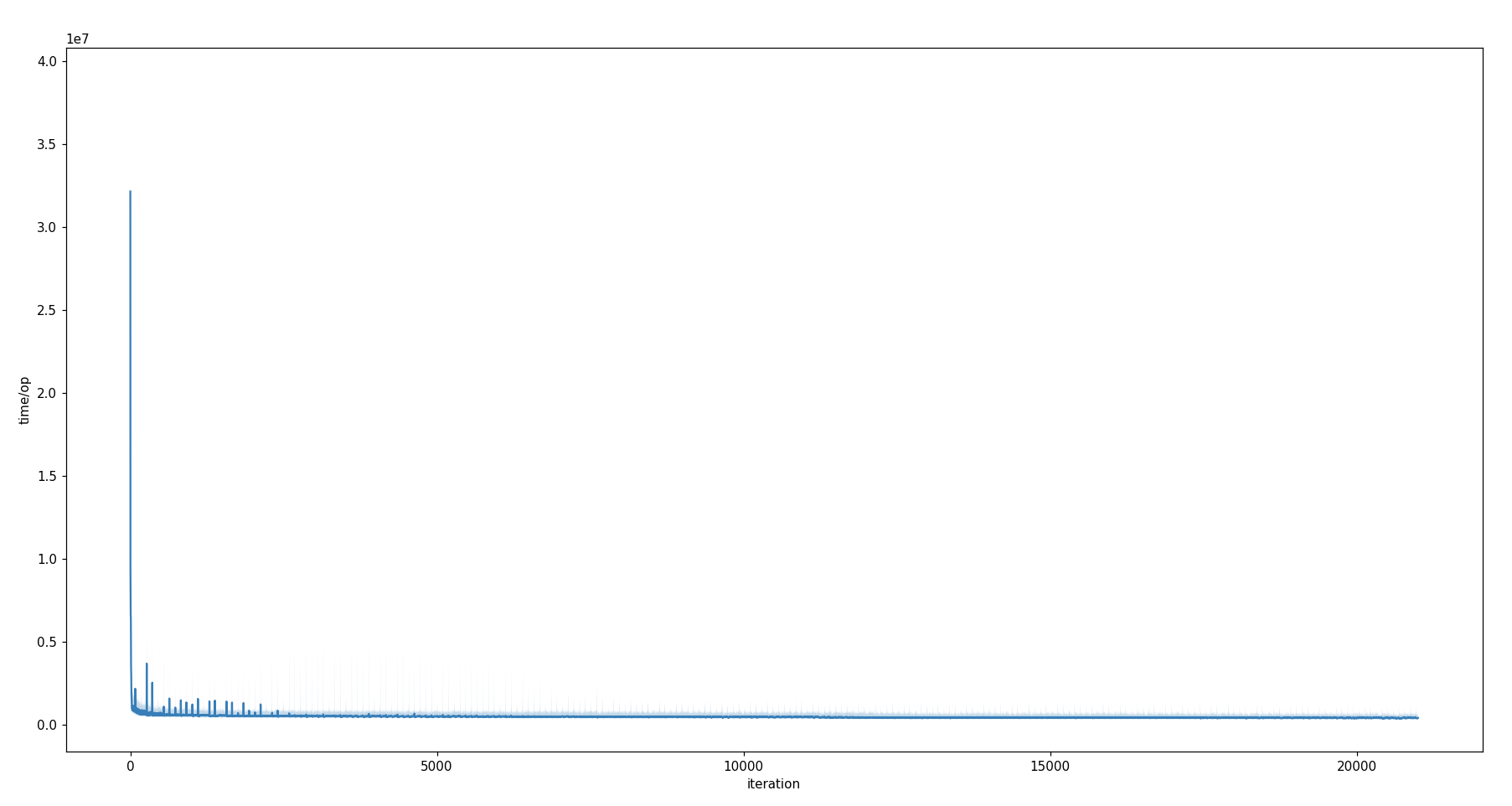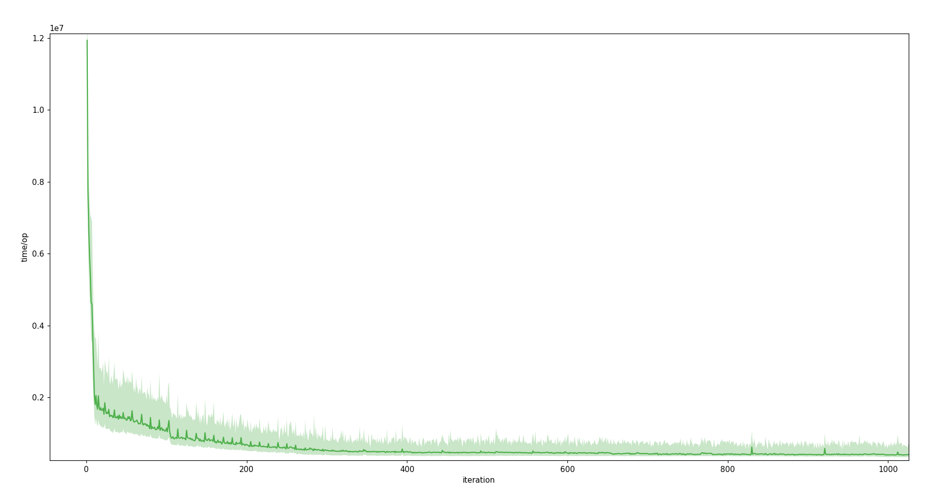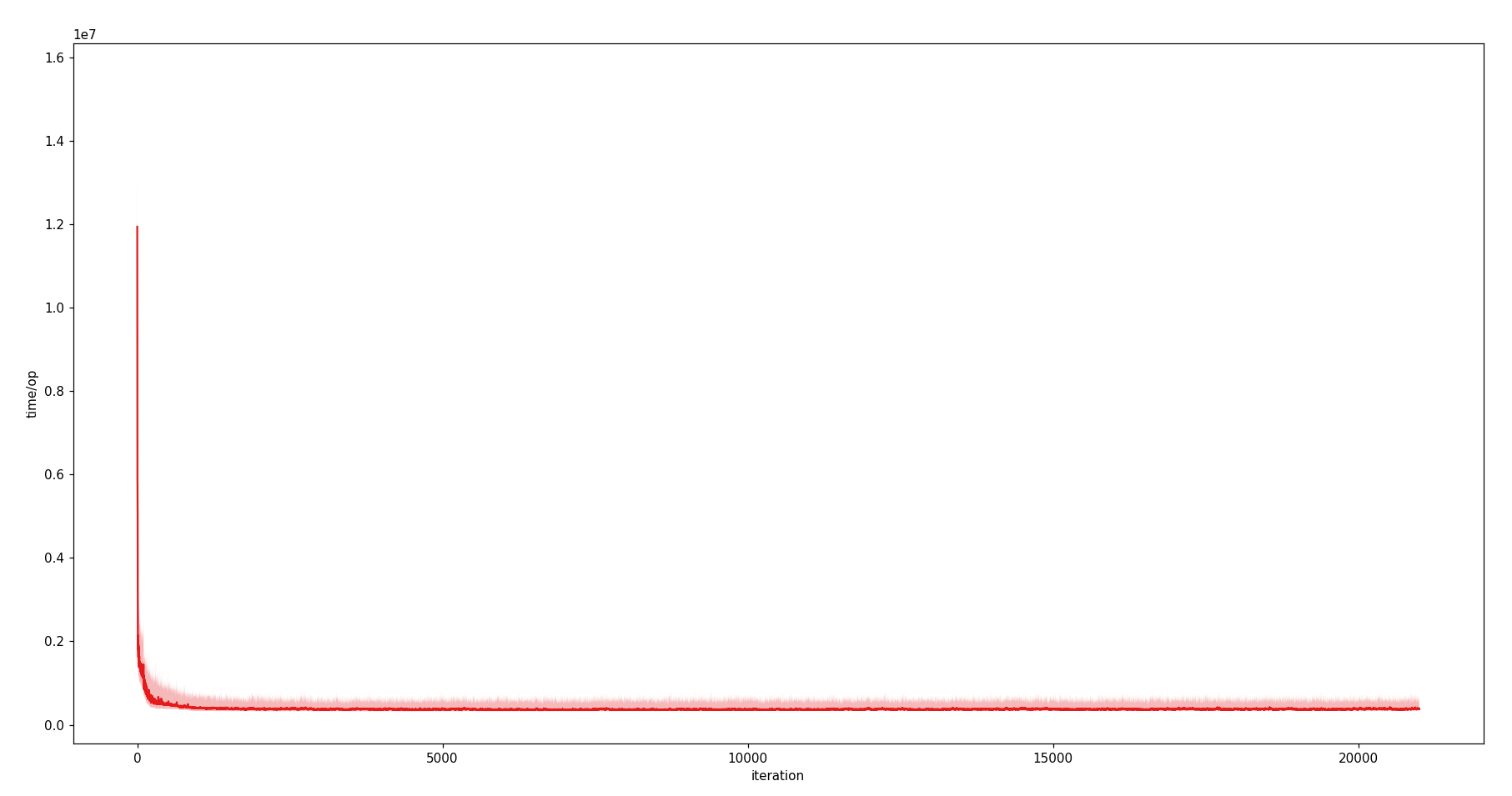 The flags -i 21000 -f 20 -to 360m would instruct JMH to run the benchmark test in 20 independent forks with 21 000 iterations each. The -to flag sets the timeout to 360 minutes. If the current fork doesn't finish within that time frame, it is aborted. With the -wi flag you could adjust the warm-up iterations. However, since I wanted to measure the warm-up itself, I set the number of warm-up iterations to 0 inside the benchmark test code.