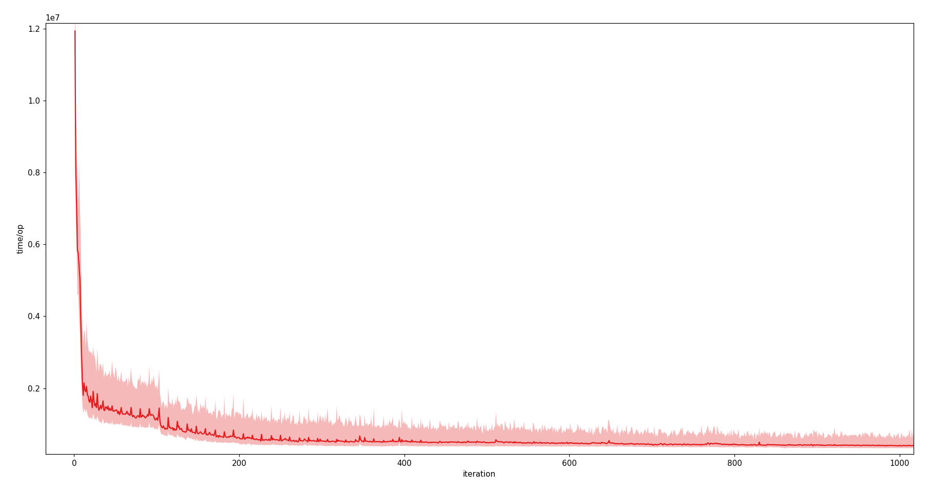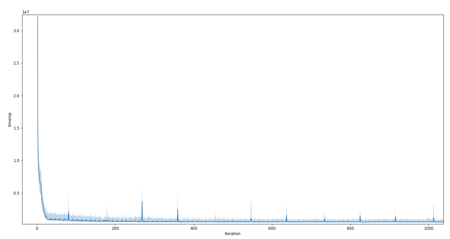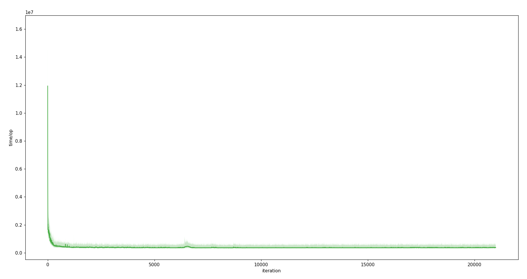 The flags -i 21000 -f 20 -to 360m would instruct JMH to run the benchmark test in 20 independent forks with 21 000 iterations each. The -to flag sets the timeout to 360 minutes. If the current fork doesn't finish within that time frame, it is aborted. With the -wi flag you could adjust the warm-up iterations. However, since I wanted to measure the warm-up itself, I set the number of warm-up iterations to 0 inside the benchmark test code.