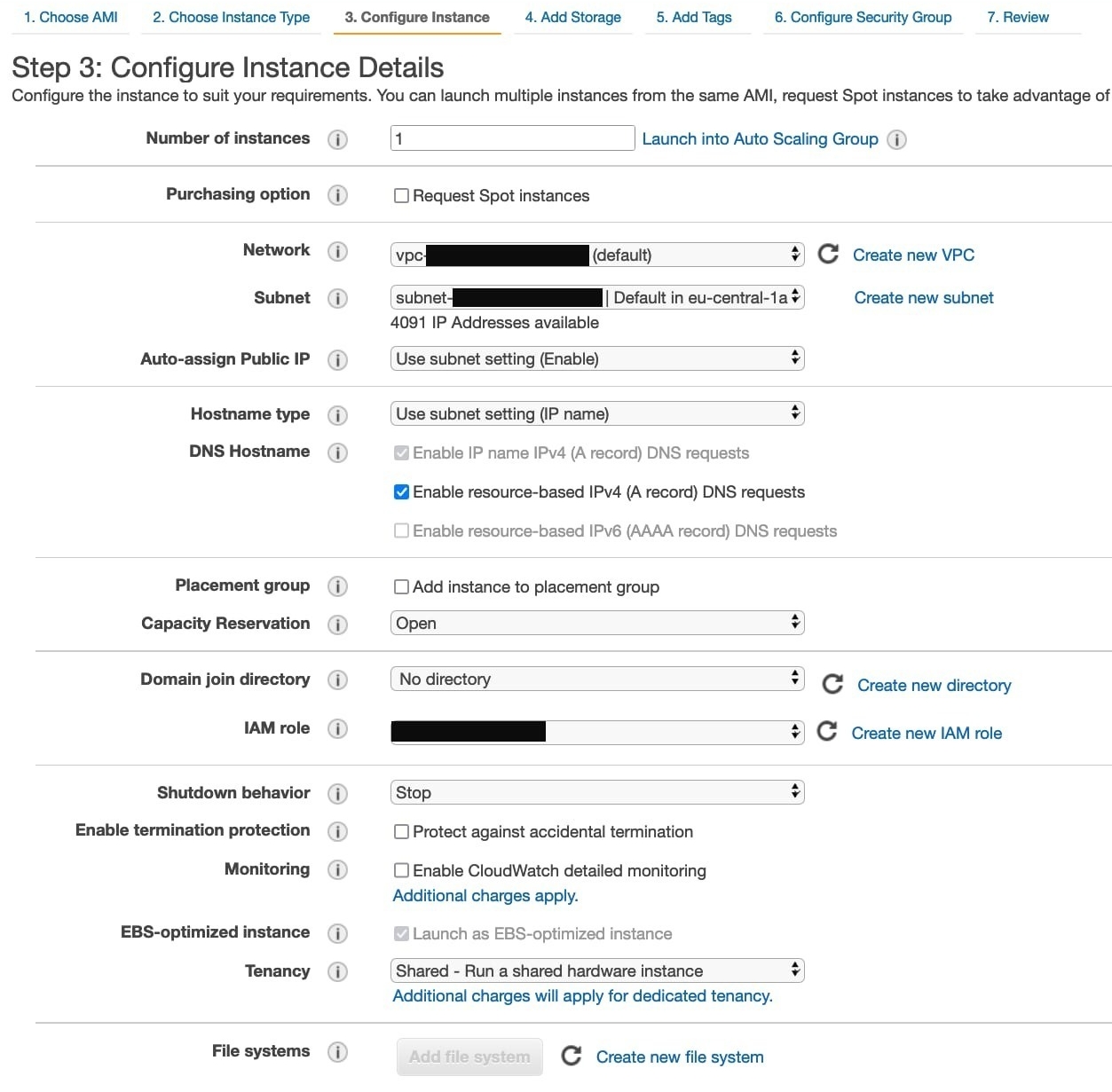 Create an EC2 (Elastic Compute Cloud) instance (for initial setup and tryout use t2.micro, for production a1.xlarge).