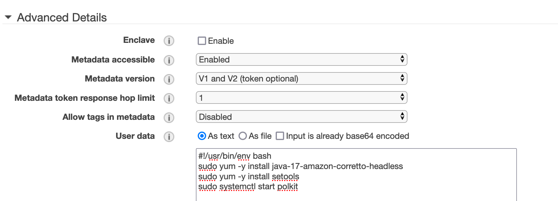 Actions > Instance Settings > Edit user data<s3-bucket-name>) and click Save.#!/usr/bin/env bash # install java 17 according to https://docs.aws.amazon.com/corretto/latest/corretto-17-ug/amazon-linux-install.html sudo yum -y install java-17-amazon-corretto-headless sudo yum -y install setools sudo systemctl start polkit # minecraft sudo mkdir /minecraft sudo mkdir /minecraft/mc-server cd /minecraft # copy disabled, as we do not want to overwrite EBS with old version from S3 every time: #aws s3 cp --recursive s3://<s3-bucket-name>/mc-server/ mc-server/ sudo chown -R ec2-user:ec2-user /minecraft # systemd service sudo aws s3 cp s3://<s3-bucket-name>/setup/minecraft.service /etc/systemd/system sudo systemctl daemon-reload sudo systemctl enable minecraft sudo systemctl start minecraft