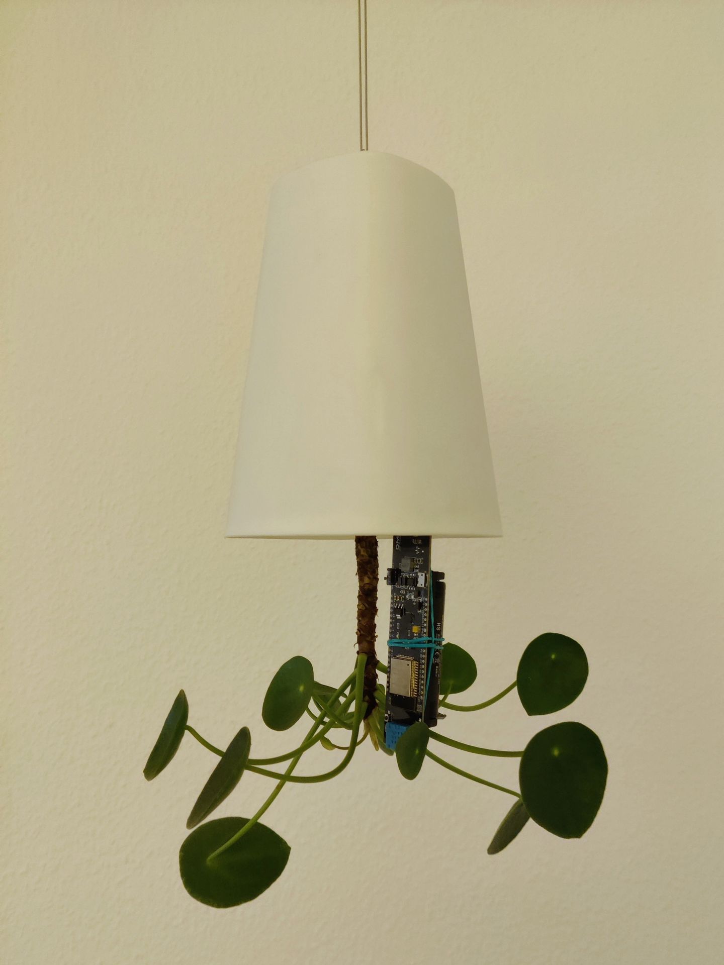 Pilea plant with sensor, growing in an upside down flower pot Pilea plant with sensor, close-up